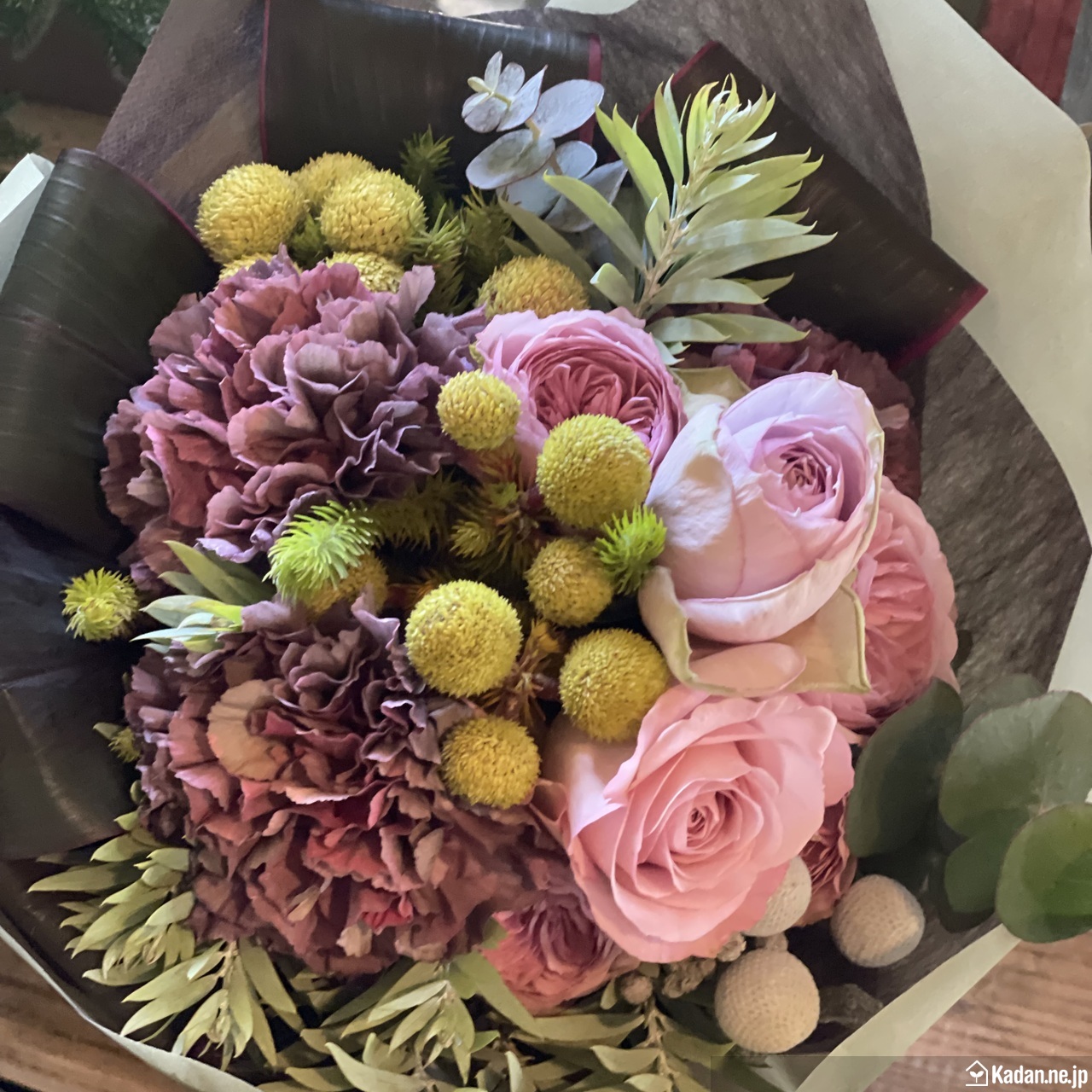 - バラ スプレーバラ カーネーション バーゼリア ブルニア 他グリーン 花束ラッピング