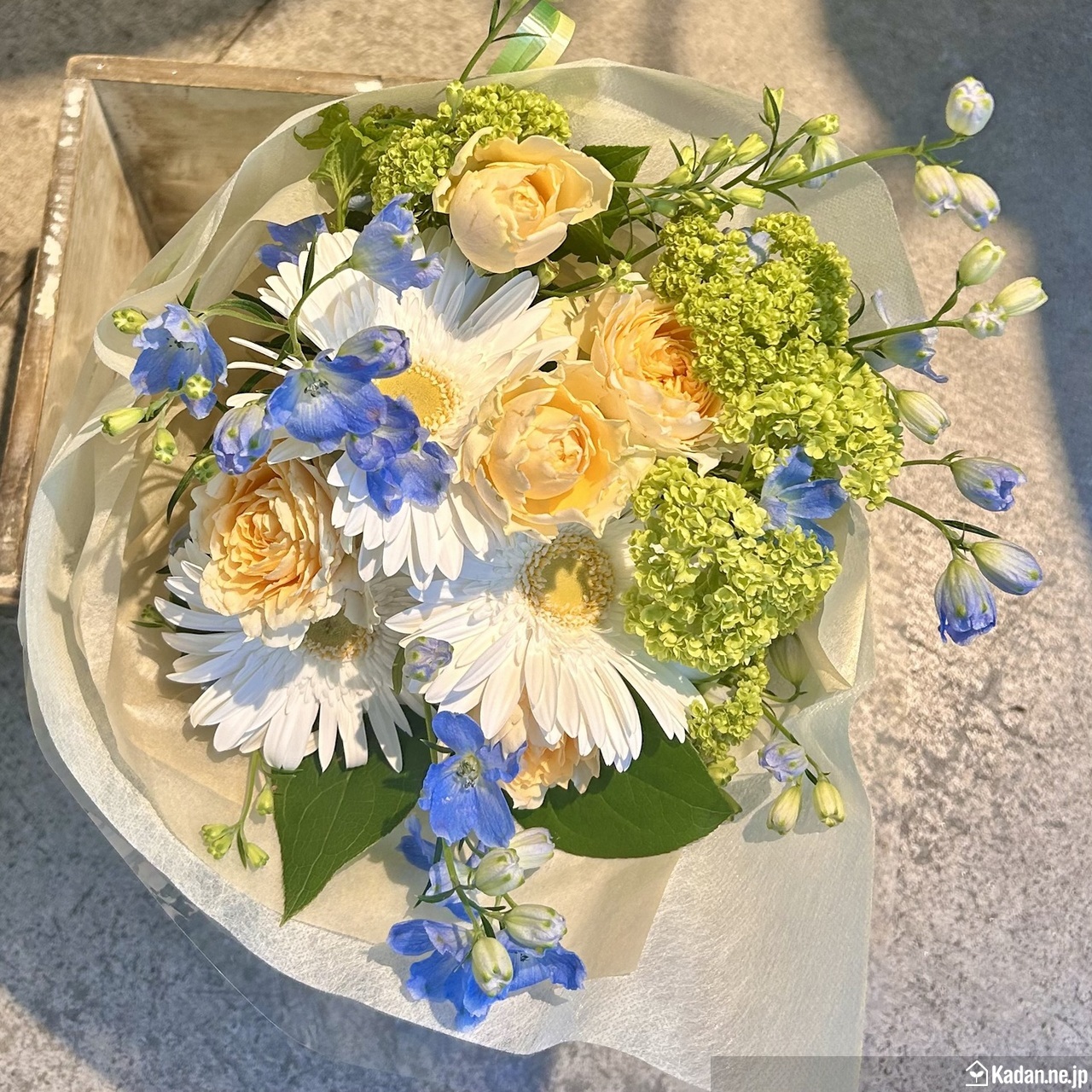 - ガーベラ、スプレーバラ、デルフィニューム、グリーンボール 花束用ラッピング